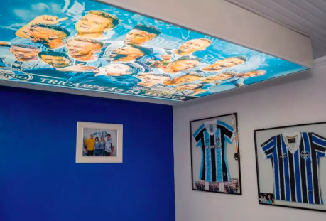 Além da decoração temática, o local guarda relíquias históricas. Entre elas, uma chuteira de Henrique Valmir da Conceição, o China, ex-jogador que marcou época e conquistou títulos importantes pelo Grêmio na década de 1980.