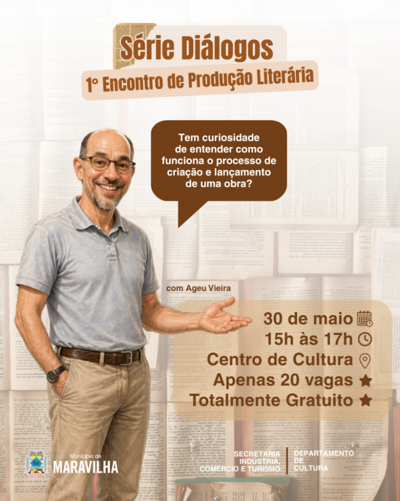 O Município de Maravilha realiza no próximo dia 30 de maio, o 1º Encontro de Produção Literária, marcando o início da Série Diálogos, iniciativa voltada ao incentivo da cultura, da escrita e da formação artística no município. A ação é realizada por meio da Secretaria de Indústria, Comércio e Turismo e do Departamento de Cultura.