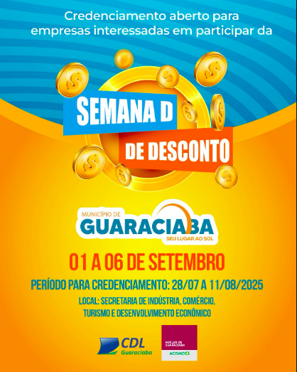 A Administração Municipal de Guaraciaba, por meio da Secretaria de Indústria e Comércio, realizará a Semana D de Descontos, movimento que pretende impulsionar as vendas no comércio local entre 1º e 6 de setembro. A informação é da secretária da pasta, Cinthia Borsatto.