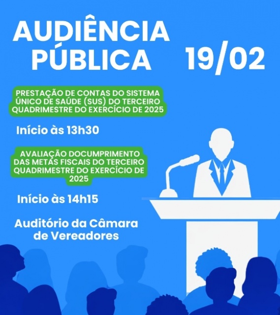 A primeira será a Audiência Pública de Prestação de Contas do Sistema Único de Saúde (SUS), referente ao terceiro quadrimestre do exercício de 2025. O encontro está marcado para as 13h30 e será promovido pela Secretaria Municipal de Saúde e Saneamento, com o objetivo de apresentar os dados, ações e investimentos realizados na área da saúde durante o período.