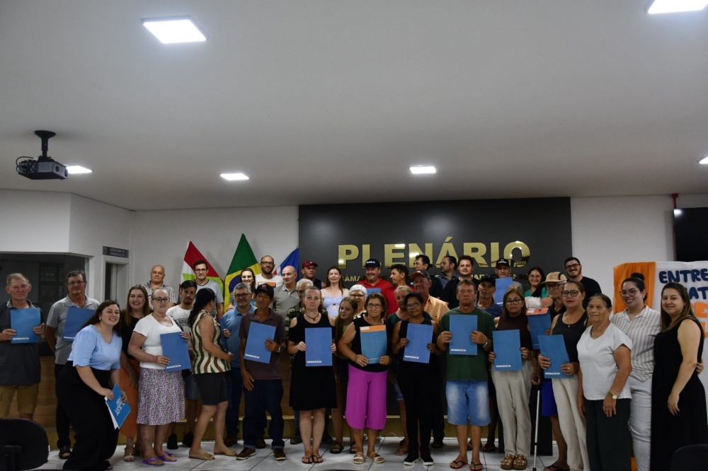 Câmara de Vereadores a entrega das matrículas do Loteamento Reurb Pelle II. Conforme